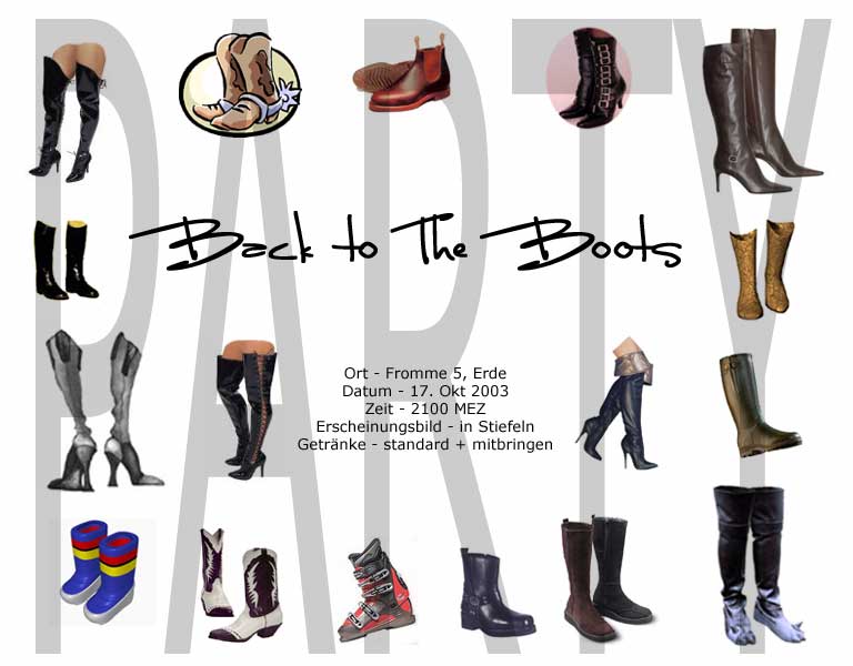 Back to The Boots Ort - Fromme 5, Erde Datum - 17. Okt 2003 Zeit - 2100 MEZ Erscheinungsbild - in Stiefeln Getränke - standard + mitbringen